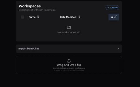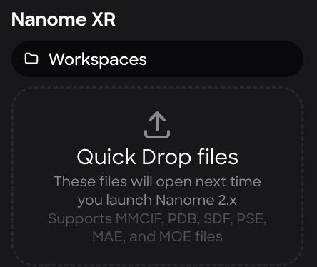 The Quick Drop area allows you to easily upload structures and session files into a Nanome v2 workspace.