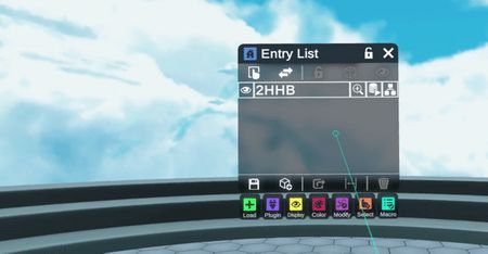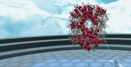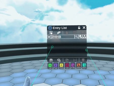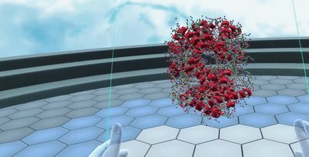 In order to scale the environment or molecular structures, press down on the middle finger 'grip' button on each controller. Next, bring the controllers together to scale the environment smaller or pull them apart to scale the environment larger.