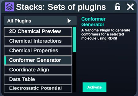The Conformer Generator Plugin uses RDKit and UFF minimization to deliver a collection of diverse, low energy conformers of a selected “seed” ligand. 3D results are captured as frames in a single new entry in the workspace. The associated minimized energy and similarity to the seed ligand (RMSD) for the seed and all conformers is accessible in both the Advanced Menu - Frames and via the Data Table Plugin.