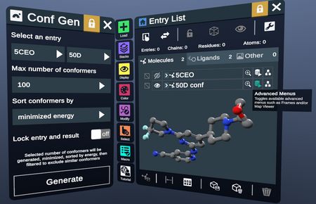 The conformer entry of frames opens in the workspace, and the new entry list item appears, with a link to the Advanced Menu for navigating frames.