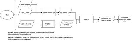 Our algorithm uses FPocket to identify potential binding sites on the moving protein, and those results are compared to the fixed binding site using Site-Motif. Site-Motif calculates alignments of each FPocket result to the fixed binding site, and the result with the longest alignment is used as the corresponding binding site. A transformation matrix is calculated to superimpose the moving binding site onto the fixed.